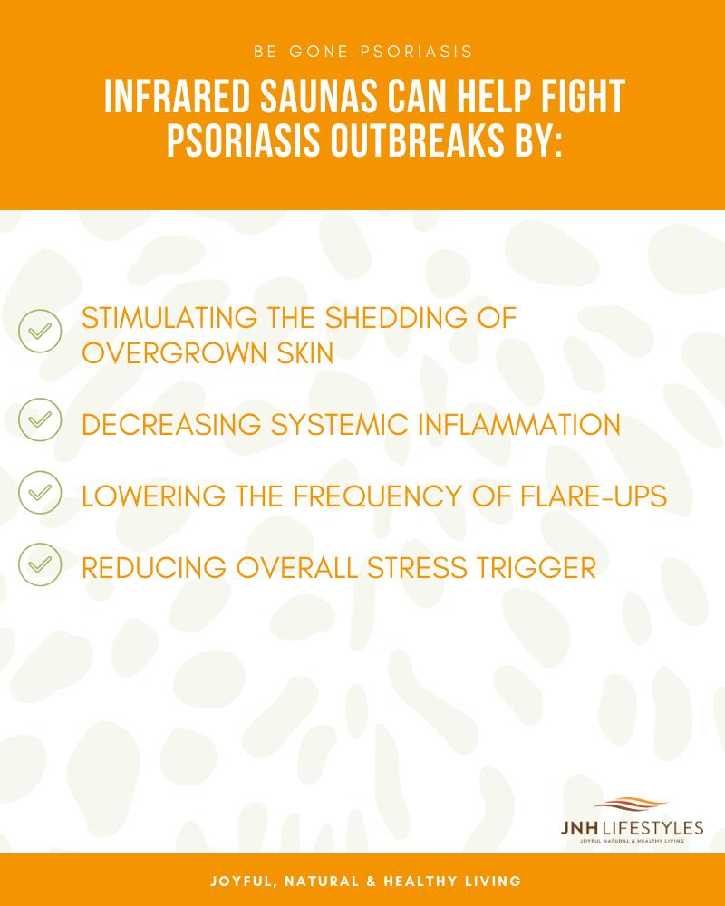 Infrared saunas have been proven to decrease systemic inflammation. Numerous studies have been performed where the levels of C-reactive protein (CRP), which is an inflammatory marker, were determined before and after several treatments with infrared therapy. Most of these studies reported a decrease in the levels of this marker, demonstrating the role it has in controlling inflammation. By doing this at a systemic level, infrared saunas do more than just help relieve the skin lesions. They can help control the progression of the disease, lower the frequency of flare-ups and prevent other inflammatory conditions [6].